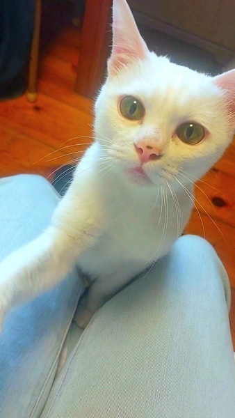 | 特徴(性格など) | 大きな瞳のしろねこのてんちゃん(天使)です。 映画『すずめの戸締まり』に出てくる大臣とよく似ています。 手足も長くて身体はしなやかです。 人間には人見知りしません。 他のねこさんと遊びたそうにします。 一度も他のねこさんと遊んだ事がないようです。 抱っこはイヤなのに側にいないと不安なのかどこでも着いてきます。 猫じゃらしが大好きです。ジャンプ力も抜群なお嬢様ねこです。 |