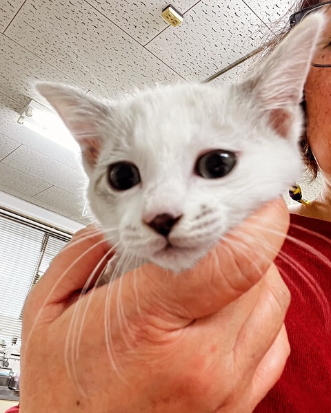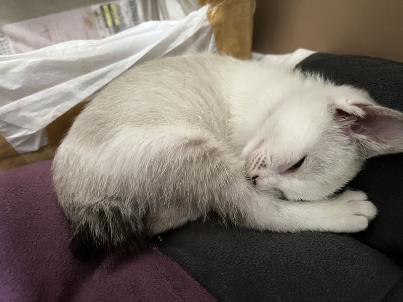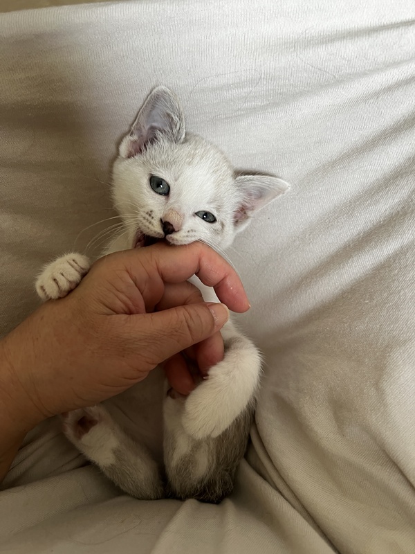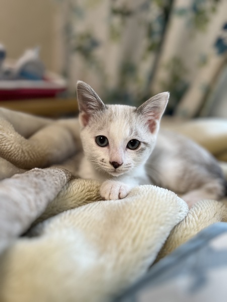 | 特徴(性格など) | 身体と後ろ脚にはグレーの模様あり。 シッポは黒っぽい毛でくるんと曲がってます。 毛布フミフミしながらチュッチュする甘えん坊ちゃん。 呼んだらちゃんと側に来ます。 カリカリご飯もお水も給水器から飲めます。 |
