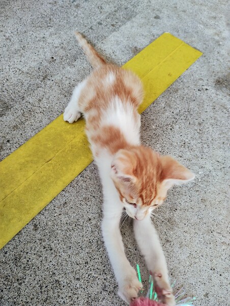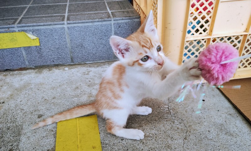 | 特徴(性格など) | 白茶トラ柄の元気な男の子です。 3兄妹のうちの1匹です。 今も外で暮らしている野良の子猫です。 性格は少しビビりですが、毎日ごはんをあげてたら、ちょっとずつ慣れてきて、撫でられるようになりました。 兄妹の中で一番食いしん坊です。 外に猫用トイレを置いたら使ってくれました。 私とおもちゃで遊んだり、姉妹猫達と一緒に元気に遊んでいます。 |