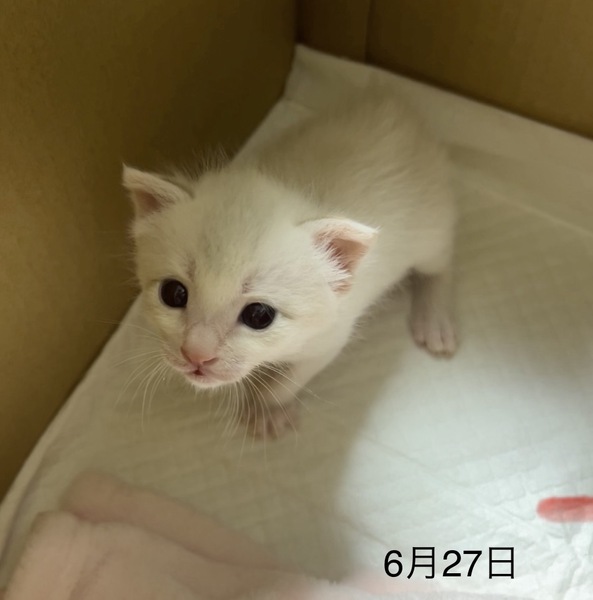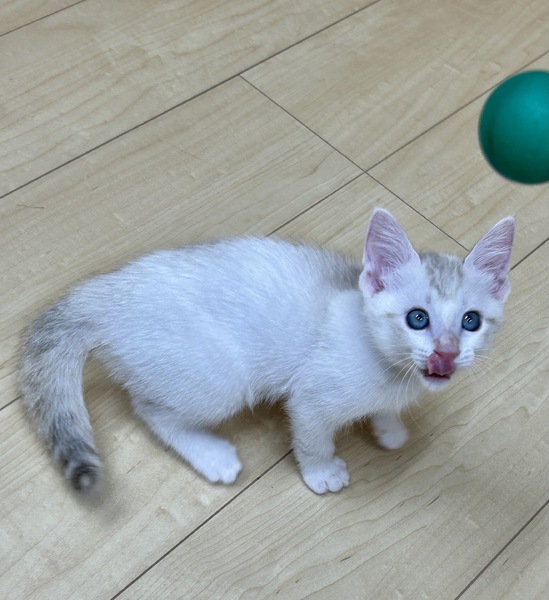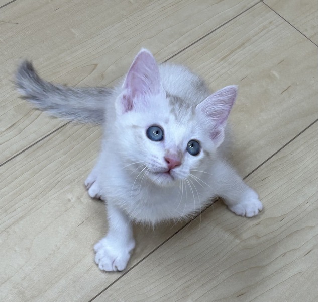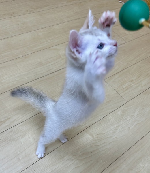 | 特徴(性格など) | ミルクから人間に育てられたので、とても人なれしています。 目が紫に近い薄い水色でとても綺麗です。 女の子ですが、かなりやんちゃです。 やんのかステップが得意です(笑) 元気すぎるほど元気で、ジャンプしたり全速力でダッシュしています。 カリカリ(ドライフード)も食べらるようになりました。 |