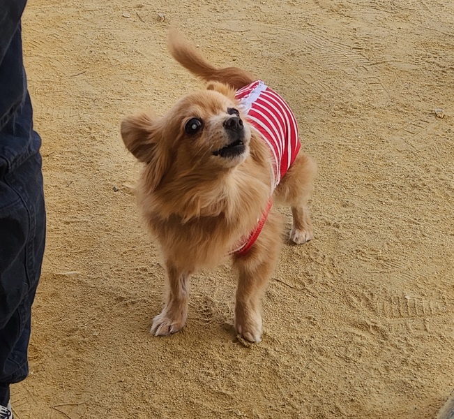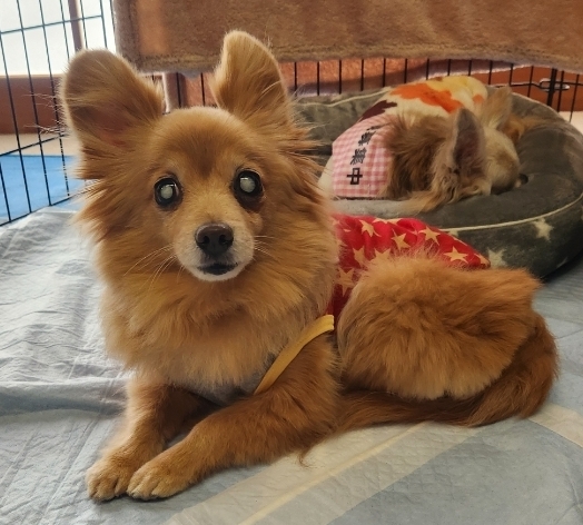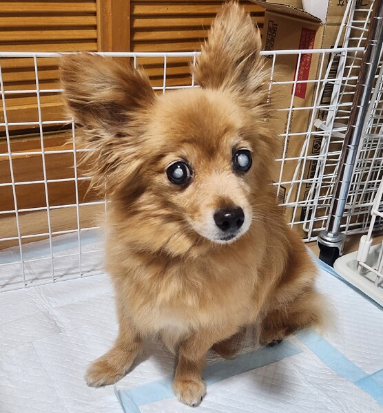 | 特徴(性格など) | 名前:ななちゃん 年齢:推定9~10歳 性別:メス 体重:3.4キロ 避妊手術済み 歯のスケーリング済み マイクロチップ挿入と登録済み 心音( 心雑音あり 6段階中1程度で初期レベル ) 検便( - ) 血液検査済み(高い低いはありますが、大きな異常なし ) フィラリア検査:陰性 2種混合ワクチン1回済み(2024年6月) 10種混合ワクチン1回済み(2024年7月) 狂犬病予防接種【猶予証明書あり。体調が安定したら、接種予定。】 ノミダニ駆虫薬投薬済み 膝蓋骨脱臼(パテラ)左右ともに無し 胆泥症あり(現在、特に治療はしていません。) 小さな鼠径ヘルニア左・右あり (特に治療の必要が無いレベルとの事。) 乳腺腫瘍摘出で悪性の為、飲み薬による抗がん剤治療を受けさせています。(2025年1月末まで) 両目ともに成熟性白内障があります。 ほとんど視力が無い状態で光を感じるぐらいです。 保護当初は気管が弱いようで咳がよく出てましたが、今は落ち着いています。 放浪していた子なので今までの過去は不明ですが、 元々一般家庭で飼われてたのか人好きで構ってちゃんです♪ 他の犬(小型犬)にも時々遊ぼう~。って誘う仕草をして 多頭でもななちゃんからはトラブル起こすことなく上手く生活しています。 目がほとんど見えていない為、 距離感が分からず近付き過ぎて他の子に怒られることはあります。 食べる事が大好きです(^_^) 偏食気味で小粒のドライフード+茹でささみやシニア用の缶詰トッピングなどを与えており、 おやつ類はお肉やお魚系の物を中心に何でも食べています。 トイレトレーニング中。 目がほとんど見えていない為、トイレシーツから離れた場所に居てると分からず失敗する事もありますが、近くに居てる時は自分で行ったり、タイミングを見ながらお散歩に連れ出したり、 トイレシーツへ連れて行ってあげると出来る時もあります。 耳と鼻は使えるので人の気配がするけど、 どこにいるか分からない時などは欲求吠えがあります。 その時は声かけてあげたり、名前を呼んでから撫でてあげると安心するようです。 |
