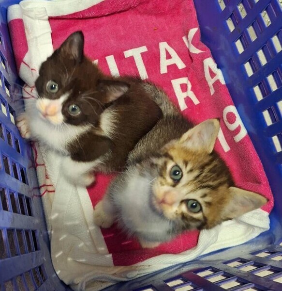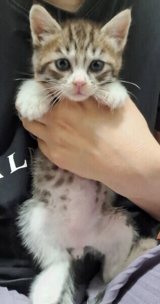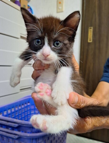 | 特徴(性格など) | ●猫の特徴など 生後1ヶ月半位(完全離乳後のお渡しになります) ①ハチワレ・メス(仮名:パーマン)→子猫らしくやんちゃ。 好奇心も食欲も旺盛ですが運動量が多いのでサファリより痩せてみえます。 慣れた場所では活発に走りますが新しいケージの遊具などには慎重です。 意思表示を鳴き声で示すので、おしゃべり猫になりそうです。 ②キジシロ・オス(仮名:サファリ)→離乳食も良く食べています。 新しいケージや遊具にも積極的に挑んで遊んでいます。 単純で、柔軟な性格なのでとても飼いやすい子だと思います。 寝るときは2匹くっついて寝ています。 私達が遊び相手をできないときは2匹で仲良くプロレスして遊んでいます。 ●保護している場所 田川郡 ●健康状態 良好。 離乳食もよく食べて元気です。 トイレの失敗も有りません。 シャンプー済み ノミダニ駆除済み ウィルスチェック マイナス(9/2追記) 9月中旬ワクチン接種を実施予定 |