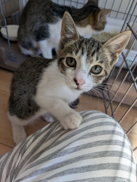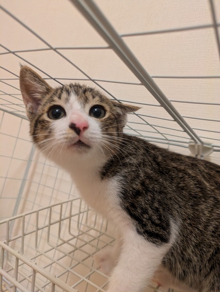 | 里親募集する理由 | 猛暑の中、ママ猫と二人三脚で頑張っていました。 生粋の野良猫ではなく、人への距離が近く、お家での暮らしができる兆しがあり優しい里親さんの元で伸び伸び育って欲しいと思い、募集いたします。 保護した時は、風邪をひいて目やにで開けにくそうでしたが、初めてのお薬、目薬、爪切りもなんなくこなしてくれました。優しいお顔と性格が愛らしい子です。 |