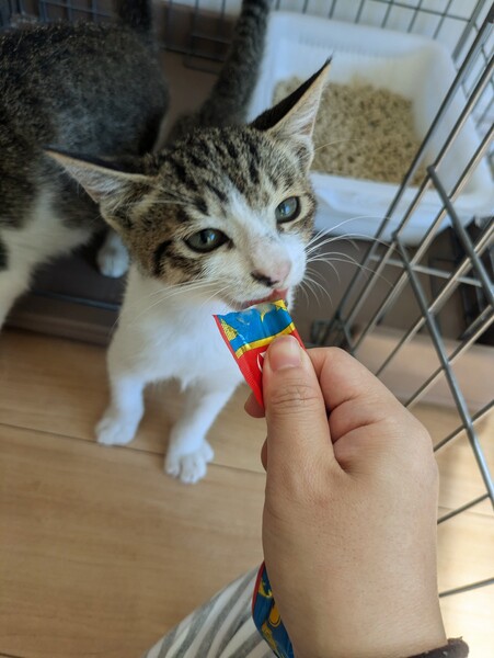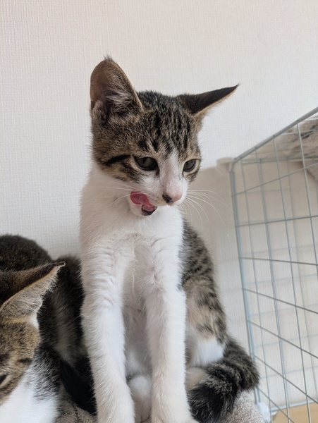 | 特徴(性格など) | キジシロの男の子✩.*˚ 少し時間がたてば人慣れも猫慣れもOKです。 基本的に優しい性格ですが、大好きな猫じゃらしは独り占めしていたり、ちゅーるは我先に食べたい!とアピールも上手にできます。今は細身ですがごはんもたくさん食べます。 エイズ白血病 陰性 ノミダニ回虫 駆虫済 ワクチン1回目 済 シャンプー、爪切り 済 お風邪はすっかり良くなりました✩.*˚ |