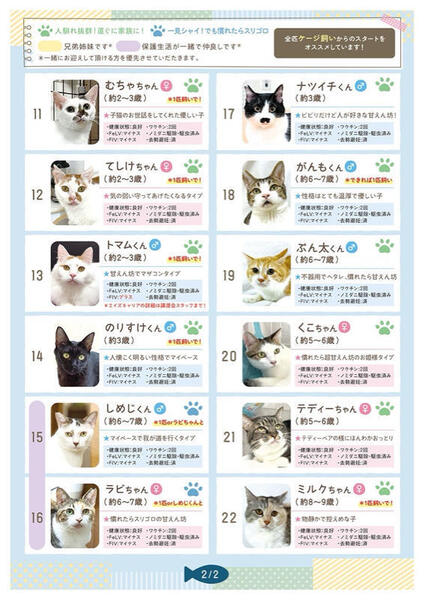 | その他(譲渡条件など) | ୨୧⌒⌒⌒⌒⌒⌒⌒⌒⌒⌒⌒⌒⌒⌒⌒୨୧ 府中駅直結⭐︎譲渡会のお知らせ ୨୧⌒⌒⌒⌒⌒⌒⌒⌒⌒⌒⌒⌒⌒⌒⌒୨୧ 【日時】9月8日(日)13時〜15時半まで 【場所】LIGHT UP LOBBY (下記のリンクに詳細あり) ※事前に整理券を配布。ご予約は必要ありません。 https://chuneko.exblog.jp/32603337/ ※会場への直接のお問い合わせはお控えください。 ご質問はfuchu_nekonokai@yahoo.co.jpまで こんにちは。『NPO法人府中猫の会』です。 地元のTNR活動&保護活動(野良猫を増やさない取り組みや行き場のない猫達の保護)に尽力しているボランティア団体です。 その他にも、当ボランティアの取り組み『熊本市殺処分STOPプロジェクト』として、139匹の保護猫達を熊本から東京に空輸して参りました。 今回ご披露する猫ちゃん達は、くまっ子空輸にゃんずの他、飼い主から飼育放棄されてしまった捨て猫や強制執行で夜逃げされた猫達など、どの子達もみんな行き場のない子達ばかりを保護し、育て上げた子達が参加します。 今回出場する子達は全匹お留守番OKなのでお仕事をフルタイムでお持ちのご家庭でも問題なく迎えていただけます。 自信を持って、この度もかわいい子ども達をご紹介させていただきます! 活動内容や保護猫達の様子が気になる方は、ぜひ!YouTubeちゅー猫チャンネルをご視聴ください。 ↓↓↓ ฅ^•ﻌ•^ฅ♡ちゅー猫チャンネル https://youtube.com/@chuneko ◆成猫さんだけ参加予定の譲渡会。 ◆血液検査、ワクチン2回接種、マイクロチップ装着、全ての医療を終えております。ご安心ください。 【 よくあるご質問 】 ◆猫を飼いたい。でも保護猫ってハードルが高い気がする… その点はご安心ください。出場する全ての猫達はみんな家猫訓練を受けており、トイレ訓練もパーフェクトな猫達です。 猫飼い初心者OKな猫ちゃんも多数出場します。 ◆60歳を超えているが、猫を迎えたい。 今時の60代様、70代様は、大変お若くアグレッシブでいらっしゃいます! そんな方々にはぜひ!成猫さんをオススメさせていただきます。 今回出場する成猫さんは、捨てられた子達ばかりです。(多頭崩壊、飼育放棄、夜逃げによる強制執行) みんな心に傷を負っている子達を保護しております。しばらく心のケアや家猫訓練をバスした子達を出場させますので、ぜひ!会いに来てください。 ※60歳以上の方は後継人をお願いしております。後継人の方とご来場いただくと私達も選考しやすいのでよろしくお願いします。 ◆わが子の為にも保護猫を迎えたい!しかし、私達家族一同、猫を飼うのは初めてです。どうしたらいいですか? そのようなご家庭こそぜひ!お待ちしております! 猫ちゃんの魅力を知っていただきたいのと、お子様が保護猫達と一緒に育つ事により『命に優しい情操教育』となると願っている当会です。 喜んでお待ちしております。 ※猫アレルギー問題があります。初めて猫を飼う方は猫アレルギー検査を事前にしていただくと私達も選考しやすいです。 特にお子様には必ず検査をお願いします。 ◆仕事があって、お留守番をさせるのが心配… ご心配はご無用です! 今回出場する子達はみんな成猫さんなので、一日フルタイムでお仕事をお持ちのご家庭でも問題なく迎えていただける子達ばかりです。 【 譲渡会にご参加くださる方々へ 】 ₍ᐞ•༝•ᐞ₎◞ ̑̑ ◎混雑を防ぐ為、入場制限をさせていただきますが、ご予約の必要はございません。 入り口カウンターにてスタッフが整理券を配布いたしますのでご協力お願い申し上げます。 ₍ᐞ•༝•ᐞ₎◞ ̑̑ ◎初めて猫ちゃんを迎える方(特にお子様のいるご家庭)は、猫アレルギーの有無を明確にしてくださると選考しやすいです。 ₍ᐞ•༝•ᐞ₎◞ ̑̑ ◎譲渡会はお見合いのみの場となっております。 ご来場前に必ず下記の事項をご参照ください。 ▶︎譲渡会のシステムについて◀︎ https://chuneko.exblog.jp/32604872/ 【見学希望やご支援者の方々へ】 ₍ᐞ•༝•ᐞ₎◞ ̑̑ いつもありがとうございます♡ 会場はホテルのカフェとなっております。 お飲み物をご注文くださればお席にご案内いたします。(入口スタッフに一言お申し出ください。) 大変申し訳ないのですが、里親希望の方々を優先的にご案内させていただくのをご了承の上、お越し下されば幸いです。 会場では、ちゅー猫オリジナルグッズも販売しております。 |