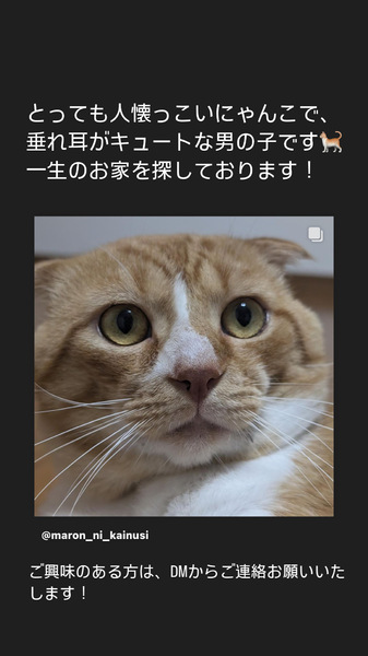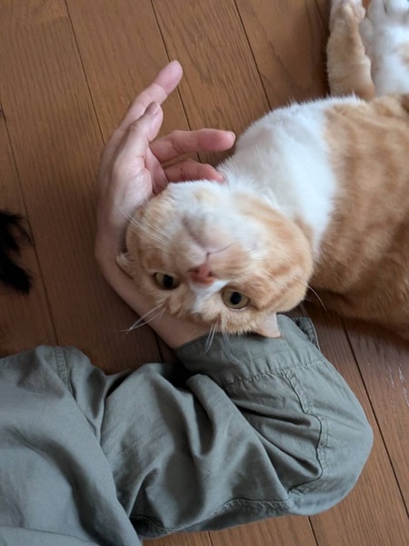 | 特徴(性格など) | 茶白のタレ耳の人懐っこい男の子です。 捕獲時より頭を撫でられたら、すぐ、コテンっと横になってお腹をみせてくつろいで甘えてくれます。 グルグル、フミフミの甘えたさんです。 |