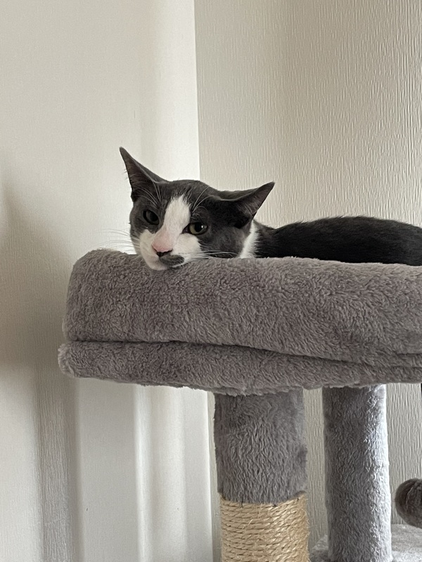 | 特徴(性格など) | 濃いグレーと白の子で手足が長くイケメン君です。 シャー言う事ありますが攻撃的なところは無く撫でたり出来ます。 おもちゃで良く遊びます。 |