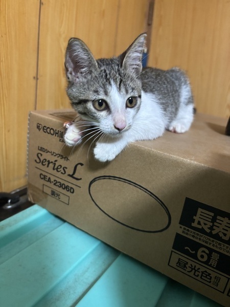 | 里親募集する理由 | 台風の近づいてきた日に友達の家の庭に避難してきたらしく、外で雨風を凌ぐには小さ過ぎるため、友人が保護。しばらく様子を見ましたが、親らしき猫も現れず、里親を探すことにしました。 | ||