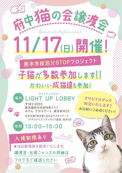 | その他(譲渡条件など) | ୨୧⌒⌒⌒⌒⌒⌒⌒⌒⌒⌒⌒⌒⌒⌒⌒୨୧ 府中駅直結⭐︎譲渡会のお知らせ ୨୧⌒⌒⌒⌒⌒⌒⌒⌒⌒⌒⌒⌒⌒⌒⌒୨୧ 【日時】11月17日(日)13時〜15時半まで 【場所】LIGHT UP LOBBY (下記のリンクに詳細あり) ※事前に整理券を配布。ご予約は必要ありません。 https://chuneko.exblog.jp/32603337/ ※会場への直接のお問い合わせはお控えください。 ご質問はfuchu_nekonokai@yahoo.co.jpまで こんにちは。『NPO法人府中猫の会』です。 地元のTNR活動&保護活動(野良猫を増やさない取り組みや行き場のない猫達の保護)に尽力しているボランティア団体です。 その他にも、当ボランティアの取り組み『熊本市殺処分STOPプロジェクト』として、139匹の保護猫達を熊本から東京に空輸して参りました。 今回ご披露する猫ちゃん達は、くまっ子空輸にゃんずの他、飼い主から飼育放棄されてしまった捨て猫や強制執行で夜逃げされた猫達など、どの子達もみんな行き場のない子達ばかりを保護し、育て上げた子達が参加します。 今回出場する子達は全匹お留守番OKなのでお仕事をフルタイムでお持ちのご家庭でも問題なく迎えていただけます。 自信を持って、この度もかわいい子ども達をご紹介させていただきます! 活動内容や保護猫達の様子が気になる方は、ぜひ!YouTubeちゅー猫チャンネルをご視聴ください。 ↓↓↓ ฅ^•ﻌ•^ฅ♡ちゅー猫チャンネル https://youtube.com/@chuneko ◆子猫も多数参加予定の譲渡会。 ◆血液検査、ワクチン2回接種、マイクロチップ装着、全ての医療を終えております。ご安心ください。 【 よくあるご質問 】 ◆猫を飼いたい。でも保護猫ってハードルが高い気がする… その点はご安心ください。出場する全ての猫達はみんな家猫訓練を受けており、トイレ訓練もパーフェクトな猫達です。 猫飼い初心者OKな猫ちゃんも多数出場します。 ◆60歳を超えているが、猫を迎えたい。 今時の60代様、70代様は、大変お若くアグレッシブでいらっしゃいます! そんな方々にはぜひ!成猫さんをオススメさせていただきます。 今回出場する成猫さんは、捨てられた子達ばかりです。(多頭崩壊、飼育放棄、夜逃げによる強制執行) みんな心に傷を負っている子達を保護しております。しばらく心のケアや家猫訓練をバスした子達を出場させますので、ぜひ!会いに来てください。 ※60歳以上の方は後継人をお願いしております。後継人の方とご来場いただくと私達も選考しやすいのでよろしくお願いします。 ◆わが子の為にも保護猫を迎えたい!しかし、私達家族一同、猫を飼うのは初めてです。どうしたらいいですか? そのようなご家庭こそぜひ!お待ちしております! 猫ちゃんの魅力を知っていただきたいのと、お子様が保護猫達と一緒に育つ事により『命に優しい情操教育』となると願っている当会です。 喜んでお待ちしております。 ※猫アレルギー問題があります。初めて猫を飼う方は猫アレルギー検査を事前にしていただくと私達も選考しやすいです。 特にお子様には必ず検査をお願いします。 ◆仕事があって、お留守番をさせるのが心配… ご心配はご無用です! 今回出場する子達はみんな成猫さんなので、一日フルタイムでお仕事をお持ちのご家庭でも問題なく迎えていただける子達ばかりです。 【 譲渡会にご参加くださる方々へ 】 ₍ᐞ•༝•ᐞ₎◞ ̑̑ ◎混雑を防ぐ為、入場制限をさせていただきますが、ご予約の必要はございません。 入り口カウンターにてスタッフが整理券を配布いたしますのでご協力お願い申し上げます。 ₍ᐞ•༝•ᐞ₎◞ ̑̑ ◎初めて猫ちゃんを迎える方(特にお子様のいるご家庭)は、猫アレルギーの有無を明確にしてくださると選考しやすいです。 ₍ᐞ•༝•ᐞ₎◞ ̑̑ ◎譲渡会はお見合いのみの場となっております。 ご来場前に必ず下記の事項をご参照ください。 ▶︎譲渡会のシステムについて◀︎ https://chuneko.exblog.jp/32604872/ 【見学希望やご支援者の方々へ】 ₍ᐞ•༝•ᐞ₎◞ ̑̑ いつもありがとうございます♡ 会場はホテルのカフェとなっております。 お飲み物をご注文くださればお席にご案内いたします。(入口スタッフに一言お申し出ください。) 大変申し訳ないのですが、里親希望の方々を優先的にご案内させていただくのをご了承の上、お越し下されば幸いです。 会場では、ちゅー猫オリジナルグッズも販売しております。 |