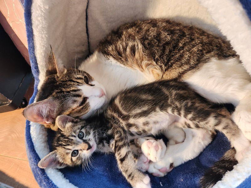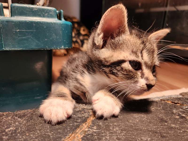 | 特徴(性格など) | タビー柄の男の子です。 ミルクから育てたので、人にも猫にも亀にもベタ馴れしています。 しっぽは鍵しっぽです。 |