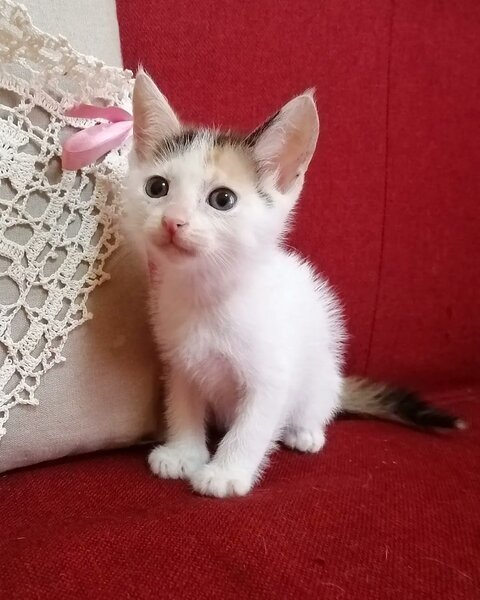 | 特徴(性格など) | ウチで生まれてから一度も外に出ていないので、とっても純粋で優しく、怖いもの知らずの可愛い性格です。 白が美しい毛並みで、頭とシッポの三毛猫カラーが個性的です。 |