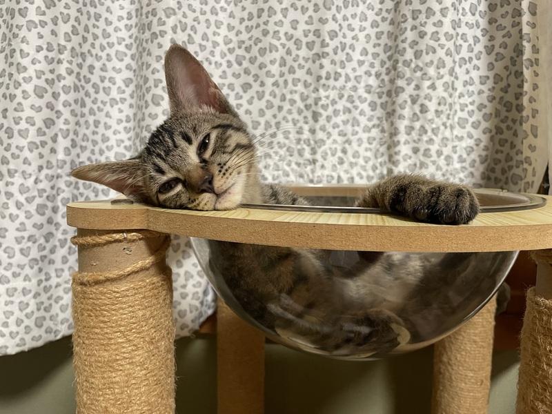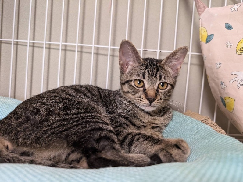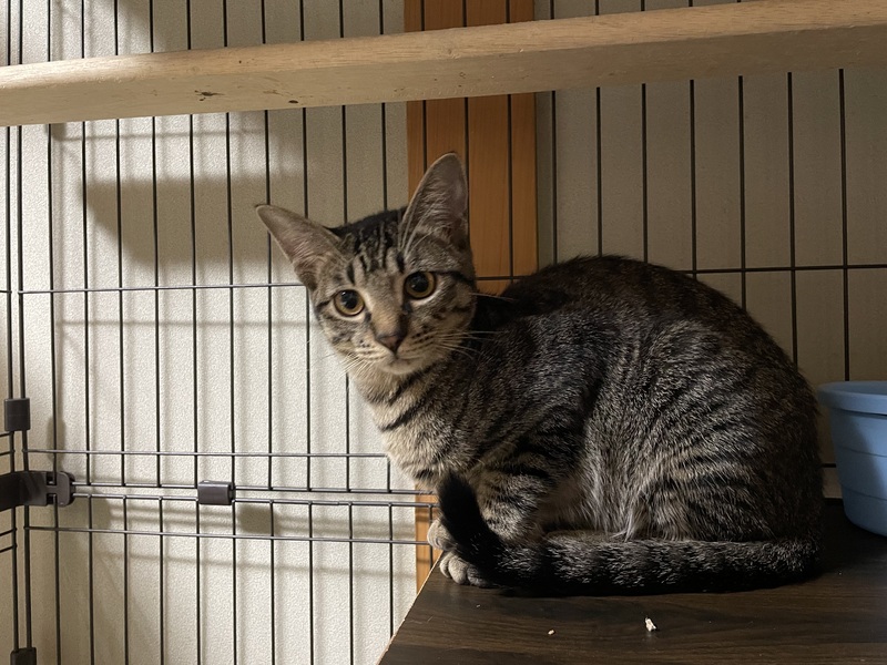 | 特徴(性格など) | 薄めのキジトラです ヤンチャでスピーディーなので飛び跳ねまくり、走りまくり、で賑やかです 悪ガキっぽい感じですが 近寄るだけでゴロゴロ喉を鳴らして可愛いところがあります 自己中でワガママですが、なぜだか憎めない可愛さです |