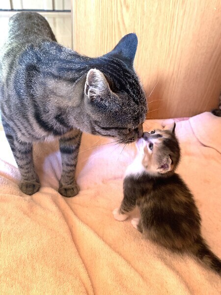 | 特徴(性格など) | 【仮名】えひめ 【年齢】推定2022年9月頃生れ 【性別】メス 【エイズ・白血病】共に陰性 【性格】妊婦の野良猫として保護され屋内で4匹の子猫を産みました。子ども達は元気にすくすく成長して里親様が決まり、一匹だけ残ったなつめ♀と親子2匹だけで過ごしています。トイレもすぐに覚え、野良で生活していたとは思えないほど人懐こくて優しい性格です。人に甘えたくてそっと寄り添ってくる子です。お外で過酷な生活をしてきたと思いますので、終生大切にして幸せにしてくださる方をお待ちしています。小さなお子さんなどがいてもとても穏やかな性格の子なので、家庭猫として良いパートナーになってくれる飼いやすいお勧めの猫ですよ! 【子ども】なつめ♀ |