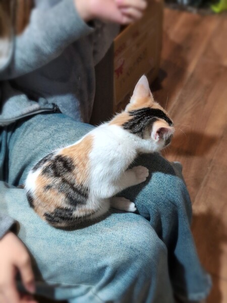 | 特徴(性格など) | ■仮名:はふ ■推定誕生日:2024年8月末頃 ■性別:女子 ■猫種:日本猫MIX ■毛色:いかにも三毛猫な感じの三毛 ■瞳の色:ヘーゼル ■尻尾:やや短めのかぎしっぽ ■体格:小さめ 姉妹のまみちゃんとの仲は良く、いつもコネコネコネコネ遊び、社会化期を健全に過ごしております。 小柄ですが足腰が強く、猛スピードで走り回り、高低差も攻略しております。 おもちゃに敏感に反応し、2時間くらいはぶっ続けで遊ぶ体力の持ち主です。 捕まえようとすれば軽やかにかわされますが、仮母のおなかの上に乗せればそのまま眠ってしまう程度には人なれしています。かわいい姿にメロメロです・・・ 保護宅の7ヶ月の兄ちゃん猫にかわいがられ、17歳の爺さん猫にも甘え、気難しい4歳の姉さん猫にもなんとなく受け入れられて一緒に寝ることを許されております。 よって、年齢近めからかなり年上まで、先住猫さんのいるご家庭でも問題ありません。 先住猫さんがよほどの猫嫌いでなければ、良い関係を築けることと思われます。 保護宅の50代の仮父仮母、成人済みのお兄ちゃんお姉ちゃん、全員と仲良くしております。 先日、元気な4歳児連れのファミリーのご訪問がありましたが、その際にもひるむことなく姉妹で遊んでもらいました。 よって、どのような家族構成のファミリーでも大丈夫そうですよ♪ まだ幼く、走り回って危ない月齢のため、見守りが十分である【お留守番少なめのおうち】におすすめです。 また、運動量が多く社会化期でもある月齢の為【姉妹でのお迎え】がおすすめです。 |