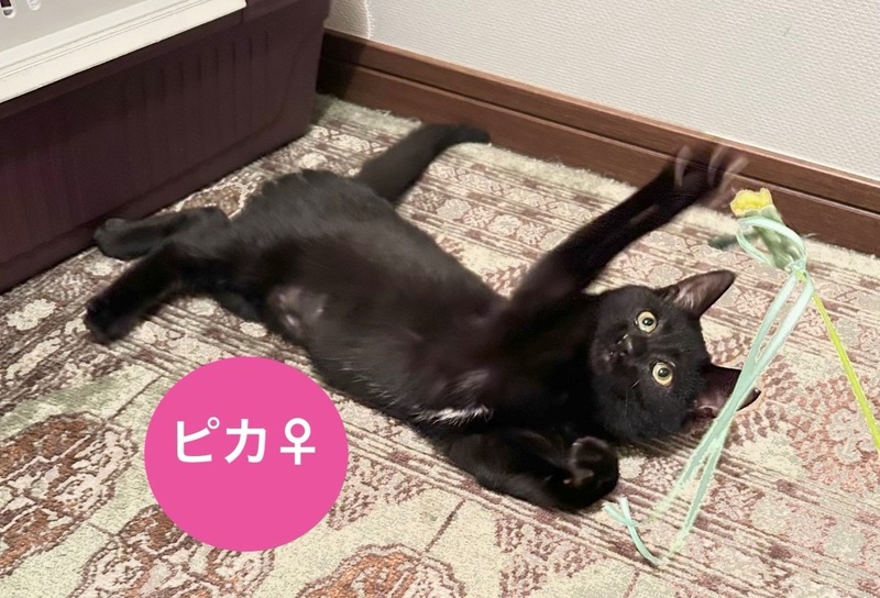 | 特徴(性格など) | 毛色:黒・胸、お腹に白あり 性格: こぐまのようなころんとした可愛らしいフォルムの気が強い女の子!おもちゃでとてもよく遊び、元気いっぱいです! 体重:約1.4キロ マイクロチップ装着: 済 飼養環境制限: 完全室内飼育 単身応募者: 可能 高齢応募者: 不可 初期医療処置:駆虫、ワクチン2回、エイズ白血病陰性 注意事項・その他:人馴れ訓練中でまだまだビビっていますが、少ーしずつ軟化中! |