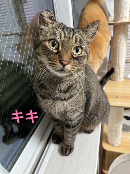 | 特徴(性格など) | 毛色:キジ 性格: 甘えん坊 体重: 4.5kg マイクロチップ装着: 済 飼養環境制限: 完全室内飼育 単身応募者: 可(条件あり) 高齢応募者: 可(条件あり) 初期医療処置 *4種混合ワクチン済 *ノミダニ予防、内外寄生虫予防済 *ウィルス検査 済 |