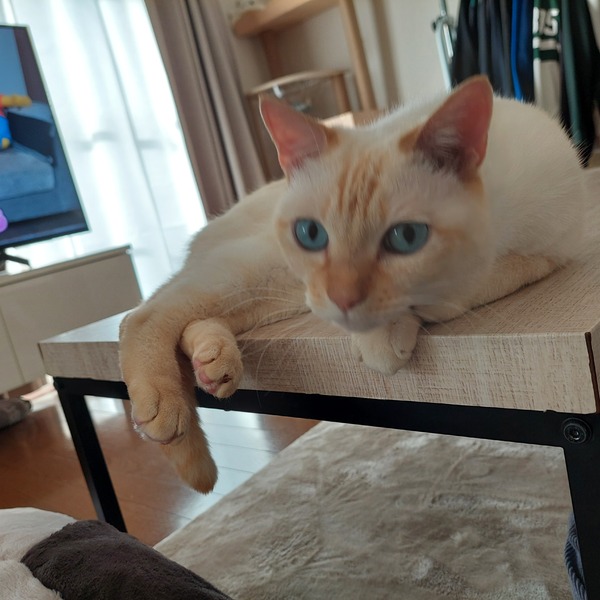 | 特徴(性格など) | 白猫(少しべージュが混ざっています) ブルーの目がとても綺麗です。 男の子なので身体は少し大きめですが、性格は甘えん坊で人が大好きです。 お喋りが上手でたくさん話しかけてくれます。 人見知りせず、スリスリゴロゴロとても可愛い子です。 お膝で爪切り、目薬、耳掃除も嫌がらず上手に出来ます。 |