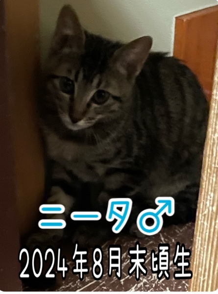 | 特徴(性格など) | キジトラ かなりのビビりですが、ご飯やオヤツに釣られます。 ゆっくり慣れてくタイプです。 エイズ・白血病、共に陰性 イーナ♀、サーナ♀、シーナ♀、ゴンタ♂ と兄弟です |