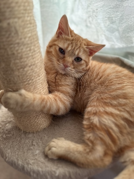 | 里親募集する理由 | 野外での多頭飼育での一斉不妊手術時に、猫風邪症状がひどく、ごはんも食べれない状況だったため、 親猫たちと一緒元に居た場所には戻せず保護されました。 茶トラは角膜の白濁、結膜浮腫の後遺症が残り今後もケアが必要です。 |