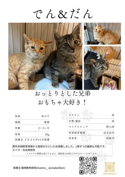 | 特徴(性格など) | キジトラと茶トラの仲良し兄弟 キジトラは甘えん坊 茶トラはマイペース キャラの違う兄弟ですがいつでも一緒仲良しです。 |