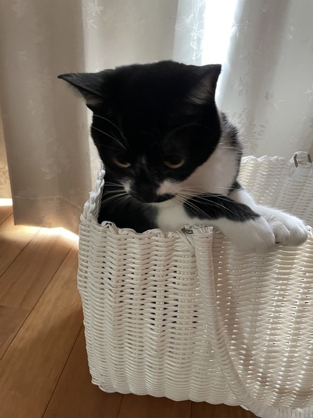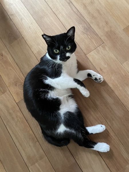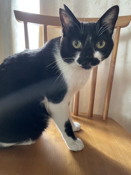 | 特徴(性格など) | おしゃべり大好きな甘えん坊の女の子。 すぐにお腹を見せてゴロゴロ言います。 顎に特徴的な模様あり(写真参照)。 体重3.5kg、短めのカギしっぽ。 |