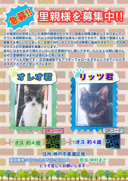 | 特徴(性格など) | キジ柄とシロキジです。 最初は警戒心がありますが飼い猫でしたのですぐ慣れるかと思います。 |
