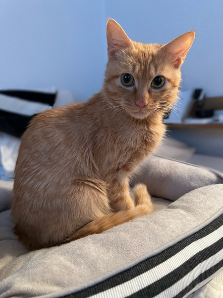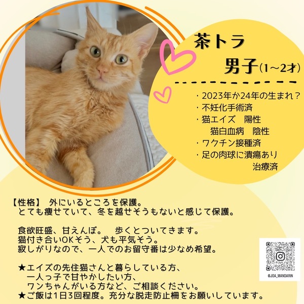 | 特徴(性格など) | 【中毛茶トラ】 食欲旺盛甘えん坊の約1〜2歳の男の子です。 保護経過2ヶ月超 出会った時から人見知りをせず、直ぐに肩の上に乗ってきたほど警戒心がありません。 甘えて甘噛みをする時があります。 歩くと着いてきます。 落ち着いている時に爪切りもさせてくれます。 寂しがりなので猫同士、犬も大丈夫そうです。 留守が少ない方、2匹以上の飼育希望です。 (FIV陽性をご理解の上) 膝の上、胸の上、肩の上や色んなところでお腹を出して甘えます。 -------------------------------------------------------------------- ガリガリだったため食事は1日3回にしています。 |