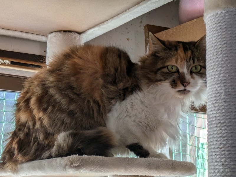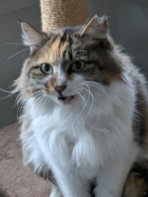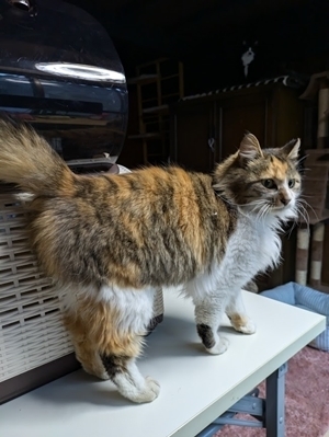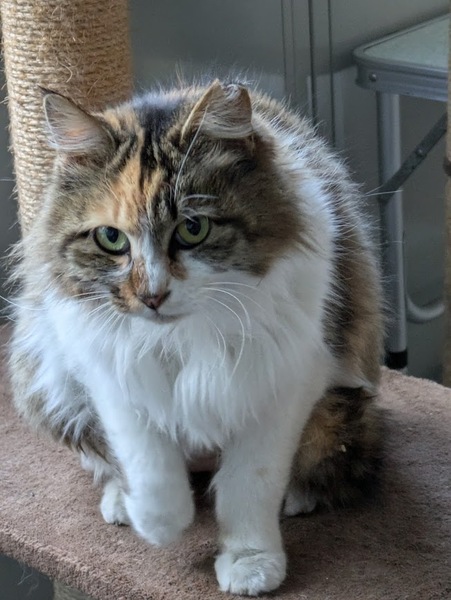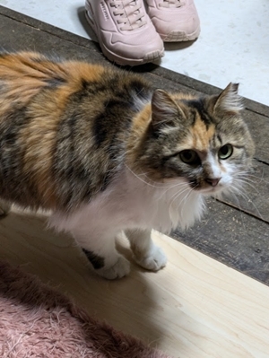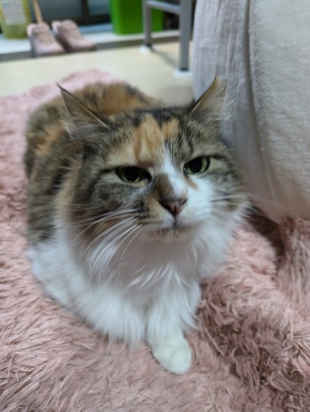 | 特徴(性格など) | 長毛の三毛猫。 とてもおとなしく、人馴れしていて、抱っこも大好きです。 他の猫とも上手に共存出来ます。 |