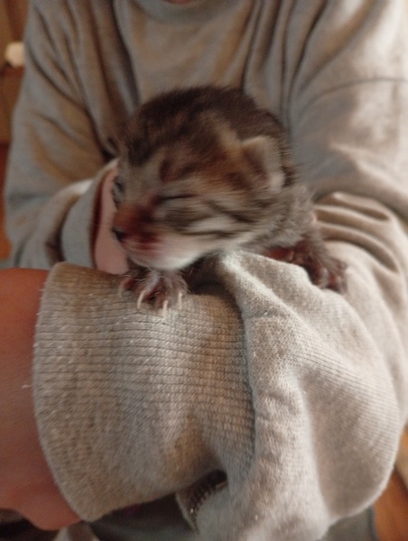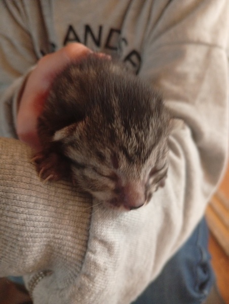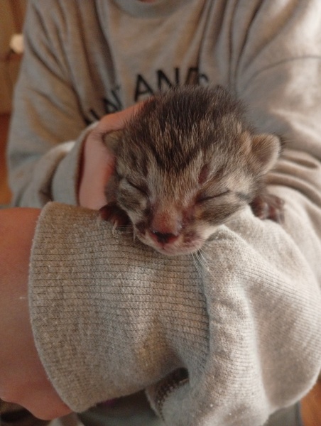 | 特徴(性格など) | サバトラ柄の子猫です。近所の草むらで、子どもたちが発見して連れて帰ってきました。目も開いていなく保護したとき濡れていたので、すぐ病院へ連れて行きました。産まれてまだ一週間くらいだそうです。今できる一通りの健康診断をしてもらいました。負担にならない程度にノミダニ駆除もしていただけました。 | ||