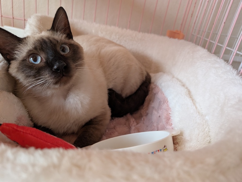 | 里親募集する理由 | 昨年12月末に突然自宅の玄関前にやって来てガラス戸から家の中をじっと眺めていたため保護しました 今年1月初めに里親様に迎えて頂きましたが先住猫の女の子2匹が体調を崩し里親様はお膝に乗って来たり甘えるこの子を手放せなくて2か月間何とか頑張ってくれましたが先住猫さんの体調が戻らず苦渋の決断でこの子を保護施設に連れてきました 大好きな家族と離れて食欲が落ち、とても寂しそうにしています 今度こそずっとの家族が見つかりますように |