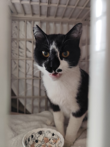| 特徴(性格など) | 黒白猫、鼻の中心は黒、細くて長い真っ直ぐなしっぽ、金目色 | ||