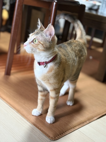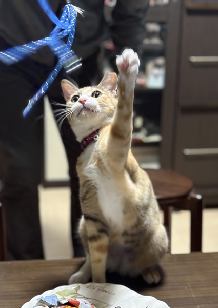 | 特徴(性格など) | 色の薄い三毛。足先は白いソックス。 尻尾は真っ直ぐ。毛並みはシルクのように柔らかくお顔も美しい女の子です。 まだ一歳未満なので歯も目もお口もきれいです。 快食快便。健康そのもの。 見た目に相応しい可愛らしい鳴き声であまり鳴きません。 とても活発でおもちゃ遊びが大好き。 1人でもよく遊びますが猫ちゃんと遊びたいタイプ。 元気なオス猫ちゃんがいるご家庭が合っていると思います。 バタバタと追いかけて遊びたがるので大人しい猫ちゃんは引いてしまうかもしれません。 抱き上げると抱きついてパクパク腕に噛みつきます。とにかくじゃれたい遊びたい時期です。 甘噛みなので穴は開きませんが結構痛いです。 噛み癖が付かないようにその都度止めて躾けるようにしています。 その辺もご理解の上で、超活発な三毛猫ちゃんが大好きな方、ご応募お待ちしております♪ 避妊手術の際に爪を全部抜かれていることが分かりました。 元の飼い主が病院で抜爪処置をしたものと思われます。 爪がないのでタワーや高い所は上手に登れませんが元気にトライします。最近はキャットウォークにも行けるようになりました。 抱っこが大好きなのに、膝にジャンプするとしがみつけないので滑り落ちます。 家具は傷つかないかもしれませんが、こんなことをする飼い主も病院も理解できません。 保護時は痩せていましたがしっかり食べてふっくらして益々可愛くなりました(^^) 体重は5/10現在で2.8キロ。まだ一歳未満なのでもう少し大きくなると思いますが小柄な猫ちゃんです。 |