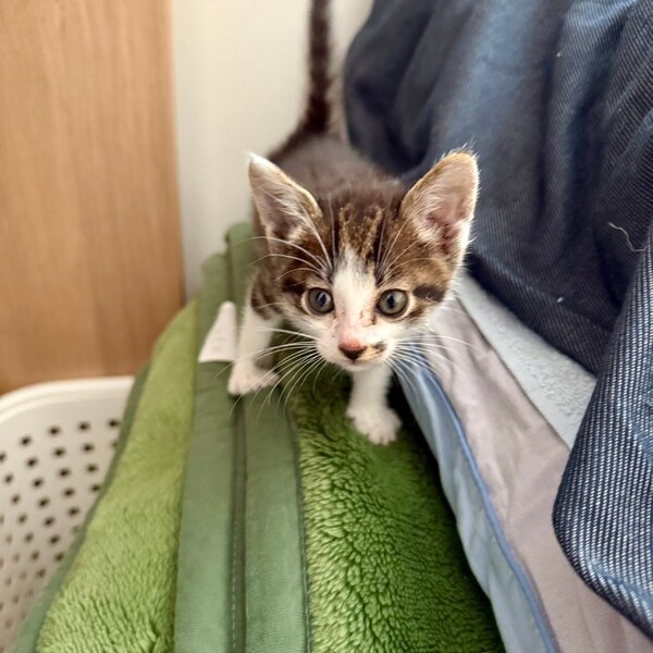 | 特徴(性格など) | 白サバ模様の子猫です。 まだ生まれて間もないため性別は不明です。 (オス?かもしれません) 健康状態は良好です。クシャミする事があるので、今は風邪薬を飲ませてます。毎日元気に走り回って飛んだり跳ねたりしてます。 性格は人慣れしてる方だと思います。トイレはうちにやって来た時から、ちゃんとトイレでしてます。賢いです。 |