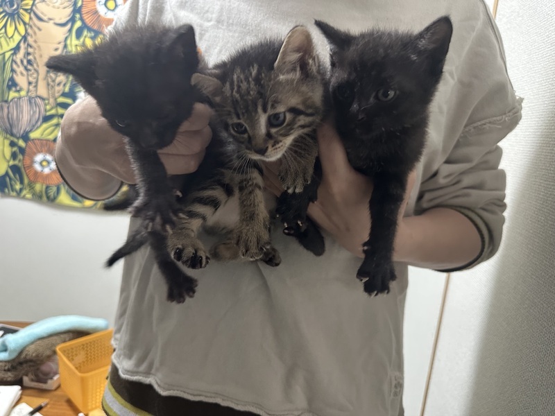 | 里親募集する理由 | 避妊手術に連れていく前日、捕獲器の中で出産。 1ヶ月は母猫が育ててくれたが 離乳食以降のため、人工に切り替え保護。 不妊手術可能な1キロ超の体重なり、手術後譲渡を検討している |