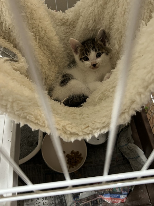 | 特徴(性格など) | 白いところに黒い水玉模様! フワフワした毛並みが可愛らしい 保護して2日目からゴロゴロ甘えん坊 なんと性格の良い猫でしょう! 育てやすい事間違いなしです |