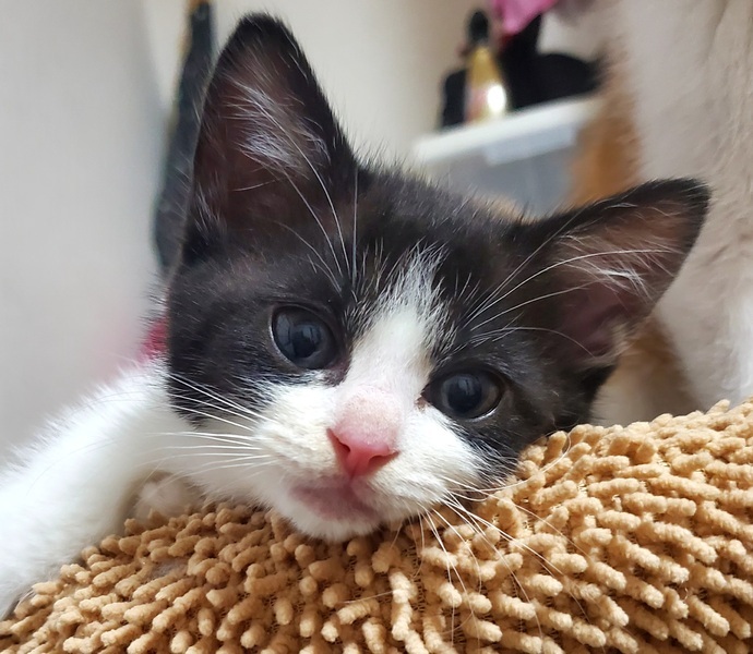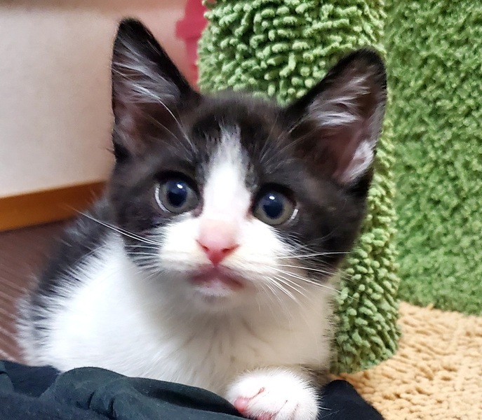 | 特徴(性格など) | 【仮名】大臣(だいじん)♂ 【生年月日】2025年5月初旬頃 【種類】ミックス 【毛色】ブラック&ホワイト 【性別】オス 【去勢】未(適齢になり次第飼い主様でお願いします9 【駆虫】済 【ワクチン】未(生後2ヶ月を経過後に接種予定) 【猫エイズ・猫白血病】子猫の為、未検査 【健康状態】保護当時、猫風邪をひいていましたが、現在は良くなってきており体調は良好です。よく食べ順調に大きくなっています。 【性格】よく遊び,好奇心旺盛です。人懐っこい性格で,誰にでも「あそんで~」と寄っていきます。 【兄弟】納言♂ |