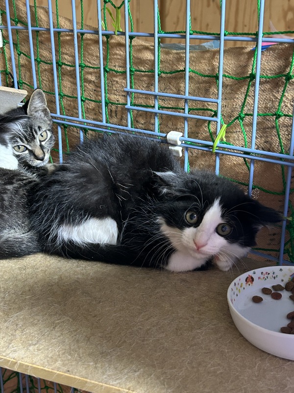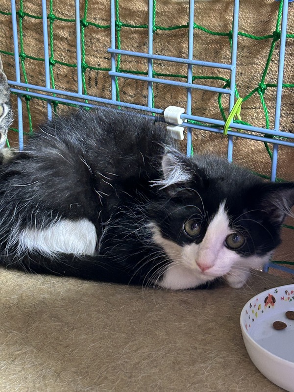 | 特徴(性格など) | 白黒長毛の男の子です。 やや警戒心が強く、人慣れ修行中です。 触ることはできます。 |