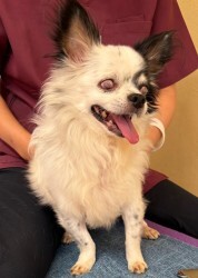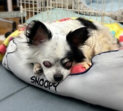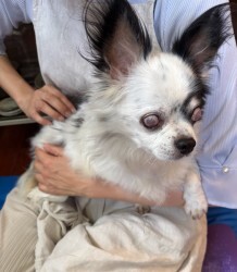 | 特徴(性格など) | ■特徴 (仮名:コロン) チワワ♂白黒 推定10歳 体重4.5キロ ※角膜障害、眼球ろうの為、両目視力はありません。 ■性格・暮らし ・人懐っこくとても甘えん坊です。 ・他の犬、猫ともそつなく暮らせます。 ・お留守番、就寝共いたずらはしないのでフリーで過ごせます。 ・室内トイレはシートで出来ます。 ・お外は大好き。リードを付けてのお散歩は練習中です。 ・両目とも見えませんが、後を付いてきていつもそばにいます。 ・食いしん坊で何でもよく食べます。 ■今までに行った医療行為 ・フィラリア検査(-)(5/28) ・5種混合ワクチン (6/12) ・検便(-)(6/13) ・健康チェック (6/18) ・血液検査(6/18) ・避妊手術(6/30) ・歯科処置(6/30) ■今後行う予定の医療行為 ・狂犬病予防ワクチン ・定期的な眼科通院 |