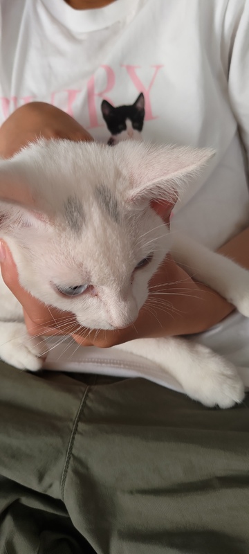| 特徴(性格など) | ほぼ白ですが、額にまろ眉のような黒があります。 見方によっては、末広がりの八に見える、縁起がいい模様です。 写真では、わかり辛いです。 とても元気です。 猫風邪は治ったのてすが、鳴き声がかすれています。 |