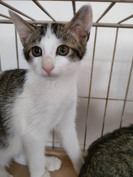 | 特徴(性格など) | キジ白の男の子です。3匹兄弟で保護しました。兄弟の中で一番体が大きくよく食べます。活発で遊ぶの大好きな子です。 エイズ、白血病は共に陰性です。 |