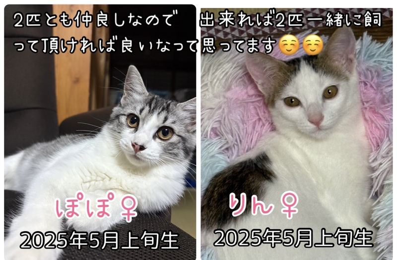 | 特徴(性格など) | 名前 ぽぽ 性別 メス 性格 怖がりですが 遊ぶのは大好き。布の下とかに潜るのも好き。 名前 りん 性別 メス 性格 食いしん坊です。遊ぶのも大好き。慣れると膝の上に乗ってきてくれます。 2匹ともエイズ、白血病共に陰性 |