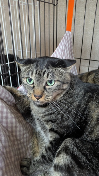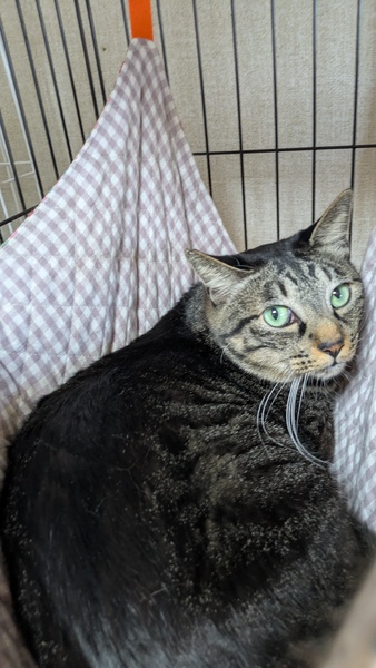 | 特徴(性格など) | グリーンの目が綺麗な、少し怖がりの大きなキジトラさんです。 | ||