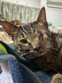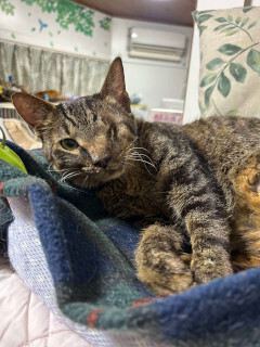 | 特徴(性格など) | 仮名を『タフ』といいます。 きじとらの男の仔。 負傷猫としてセンターに収容されました。 交通事故に遭ってしまったようで、顔面の損傷が激しく瀕死の状態でしたが、65日間もの入院生活を送り、獣医師の先生や看護師さんのおかげで一命を取り留めることができました。 そしてタフの頑張りは相当なものでした。 退院後も、タフの命綱だった食道チューブからの栄養管理を行い、そのためトレードマークのようなエリカラを着用、ボラさんのハンドメイドで、当時のタフはかなりの衣装持ちでした♪ ”タフ”という名前は、入院先の主治医の先生が命名してくださり、その名の通り奇跡的な回復力をみせてくれて、なんと、お口から流動食ではありますが食べられるようになったのです!! 現在は食道チューブからではなく、ボラさんレシピの数種類を混ぜた、特製のタフ専用フード(流動食)を食べています。タフのお楽しみです! 栄養満点の専用フードで、痩せていた身体もふっくらとなり、抱き心地抜群のボディになりましたよ。 タフは大変な思いをしてしまいましたが、人見知り、猫見知りなしのムードメーカー♪ 「タフー♡」と呼ぶと可愛い声でお返事してくれます。 素直なとってもいい仔です。 お膝に乗るのが大好きで、乗りながらスリスリ….嬉しいよを伝えてくれて、そんな姿をみていると、保護施設での共同生活ではなくて、タフにも家庭の中で、家族の中心となって、猫生を送れたらと思うようになりました。 タフの幸せを考えればこそ…. 皆んなを笑顔にしてくれること間違いなしです。 鼻水が出ますので、優しくテッシュで拭き取ってあげてください。 タフのフードのことや、体調面などご心配な点は、お迎え後もフォローさせていただきますので、ご安心ください。 先住猫ちゃんのいるお家でも、タフは上手く共生できるでしょう。 残せた右眼は視力もあり、元気に過ごしています。 タフを家族に迎えていただけないでしょうか? タフにはまたたび家で会えます。 お見合い大歓迎です。 【医療処置情報】 これから実施のも含まれます *健康チェック *3種混合ワクチン接種 *ウイルス検査実施(FIV.FeLV共に陰性) *検便実施 *駆虫薬投与(レボリューション、ドロンタール) *マイクロチップ装着 *不妊・去勢手術 |