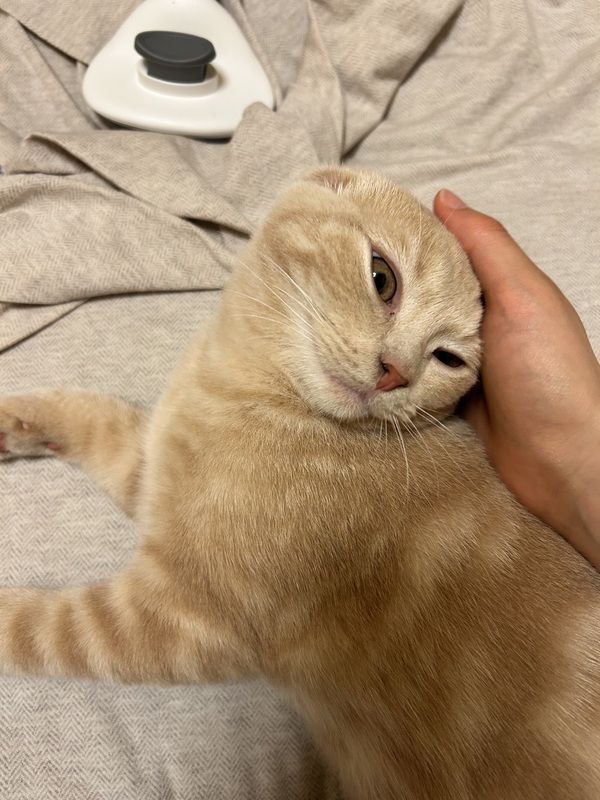 | 特徴(性格など) | 猫種:スコティッシュフォールド 色柄:クリーム/クラシックタビー 性格:ビビりの甘えん坊さんです ご飯:朝晩2回あげており、おうちに来た1日目から完食しています トイレ:1日2回のご飯後に、粗相することなくトイレできています その他:小さな物音に敏感で、ウトウトしててもよく目を覚ますビビりさんです。 ですが、気を許した相手には、何度もなでなでを要求してくる甘えん坊な猫ちゃんです |