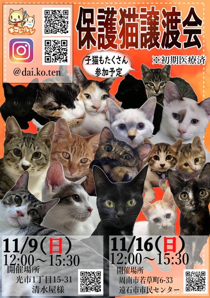 | その他(譲渡条件など) | 兄弟一緒にもらって頂けると嬉しいです。 詳しくは電話、又は譲渡会で。 11/16周南市遠石の譲渡会に参加しします。 |