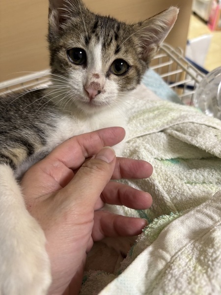 | 里親募集する理由 | 友人からの保護依頼。 地域猫に餌やりをしている友人宅に1人で現れました。数日餌やりをしながら様子を見ていましたが、凄く痩せていて、目やに、下痢などあり、元気もなくなってきたので保護しました。 今は保護してから1週間で300gも増えて元気いっぱいです! |