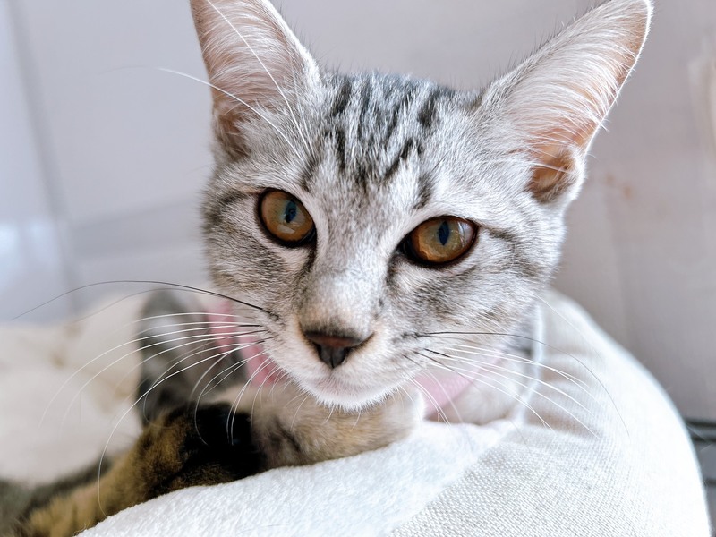 | 特徴(性格など) | 2025.7.23生まれ(推定) 毛色:サバトラ 甘えんぼの女の子。 とにかく人に甘えたいので、まっすぐにお膝の上に乗ってきます。 アメショ風のまっすぐしっぽさん。 少し独占欲が強めで、他の子が甘えていると割り込んできます。 |