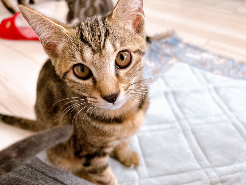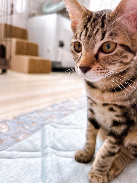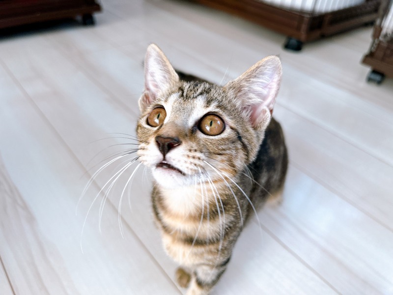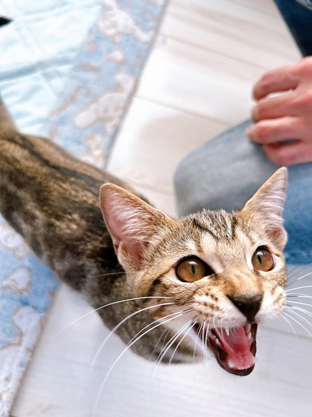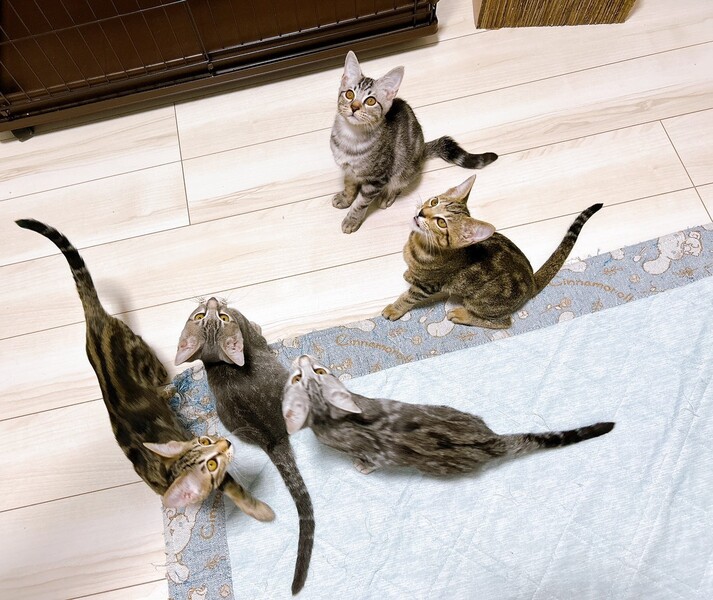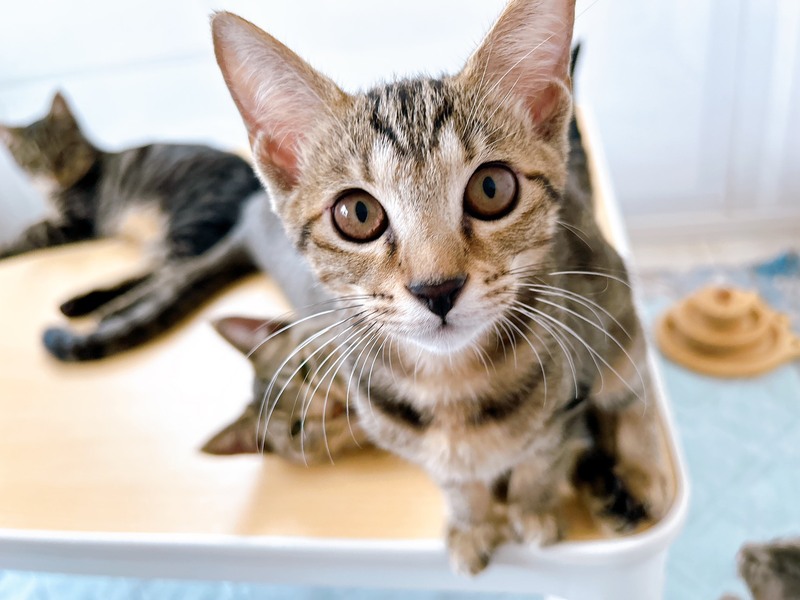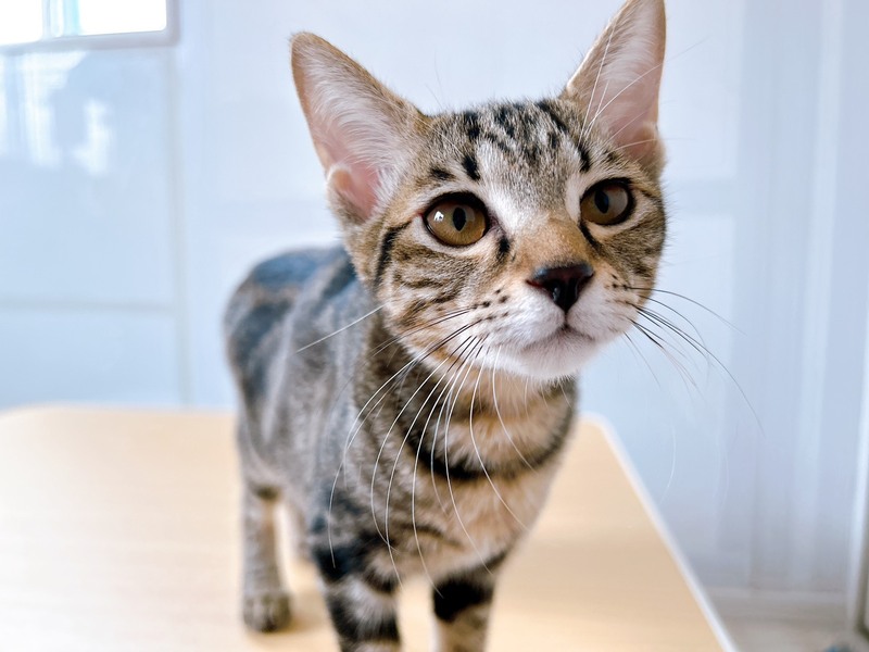 | 特徴(性格など) | 2025.7.23生まれ(推定) 毛色:キジトラ よく遊んで、よく食べるお転婆さん。 運動神経がとてもよく、ダイナミックなジャンプを披露してくれます。 周りの空気が読める子なので、他の子が甘えていると譲ったりする優しい子です。 |