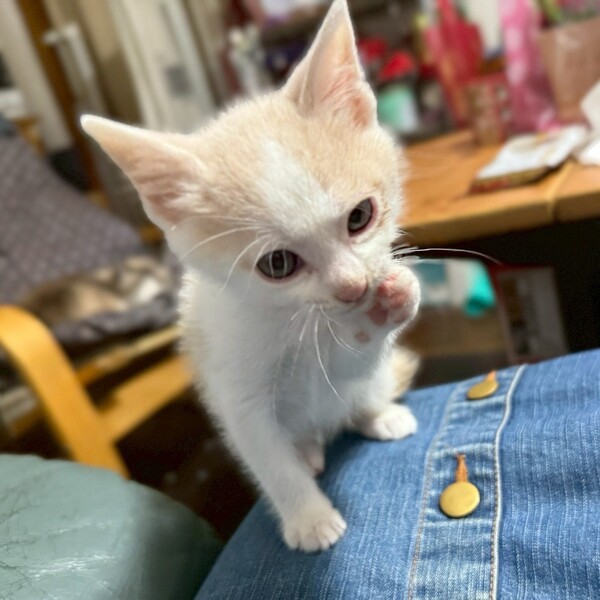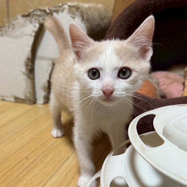 | 特徴(性格など) | ・アピールポイント:愛らしい見た目とは裏腹に、とにかく活発です。部屋中をボール玉のように走り回っています。オモチャでも上手に遊べます。食欲より遊びが優先な面が有ります。甘えん坊で寝る時は人にくっついて寝ています。途中から一人っ子になった割に社会化ができているのか、甘噛みが優しいです。 ・譲渡先の希望:同居猫と一緒か、年の近い先住猫さん(〜2歳くらいまで)がいるお家希望。まだ小さい子猫のため、お留守番が4時間程度のお家。60歳以上の方はNGです。 ・健康状態:良好です。 エイズ 陰性 白血病 陰性 |