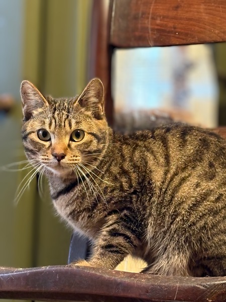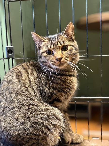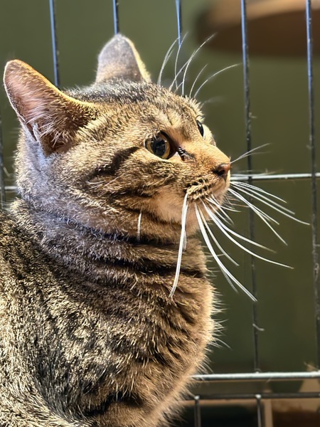 | 特徴(性格など) | まあるい感じの体型がかわいいキジトラの女の子です。 ガブリエルと兄弟になります。 くりくり目でボブテイルが特徴です。 お母さんとガブリエルと一緒に保護されました。 お母さん猫とガブリエルや他の保護猫と一緒に仲良くしています。 |